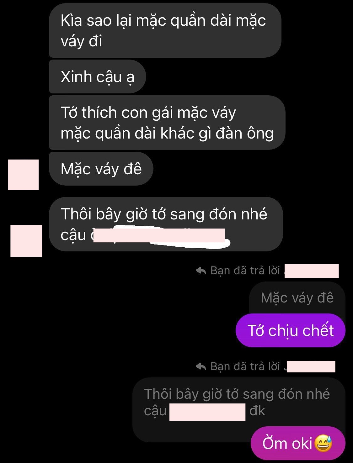 Theo đó, trước khi hẹn hò, bạn nam đã ngỏ lời để qua nhà đón V.A. Cô nàng cũng bày tỏ sự bối rối vì không biết phải mặc gì trong lần gặp gỡ đầu tiên này. Song, M. chủ động nhắn: “Sao lại mặc quần dài, mặc váy đi. Tớ thích con gái mặc váy, mặc quần dài khác gì đàn ông”. Dẫu vậy, V.A vẫn giữ vững quan điểm, diện những trang phục quen thuộc mà mình cảm thấy thoải mái nhất.