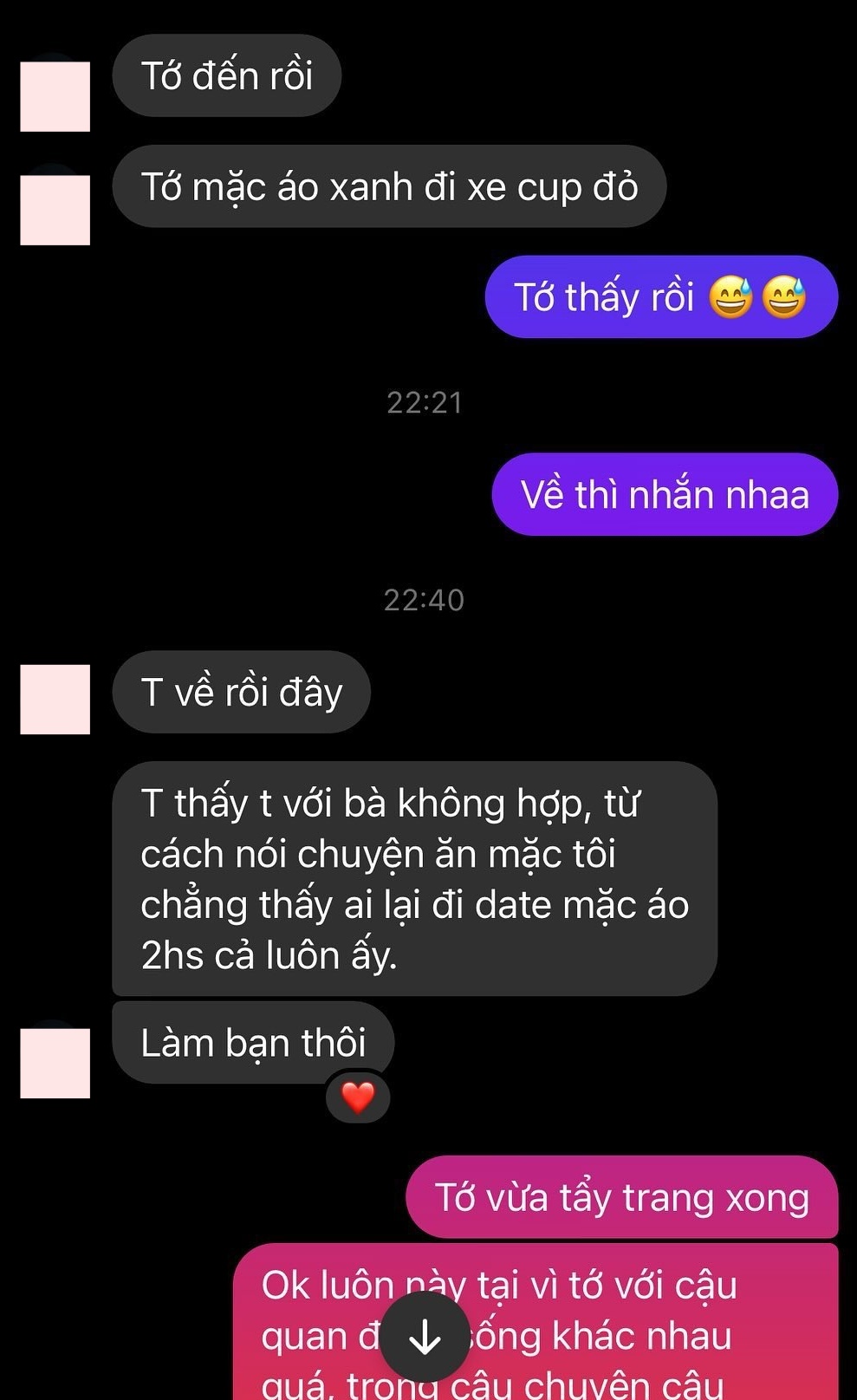 Sau đó, khi kết thúc buổi đi chơi, M. đã nhắn ngay cho cô gái để từ chối tiếp tục mối quan hệ. Lý do được đưa ra là vì cô gái mặc áo 2hand (đồ đã qua sử dụng) để “đi date” nên anh chàng cảm thấy chỉ phù hợp làm bạn. “Tôi thấy tôi với bà không hợp, từ cách nói chuyện, ăn mặc. Tôi chẳng thấy ai đi date lại mặc áo 2hand cả. Làm bạn thôi”.