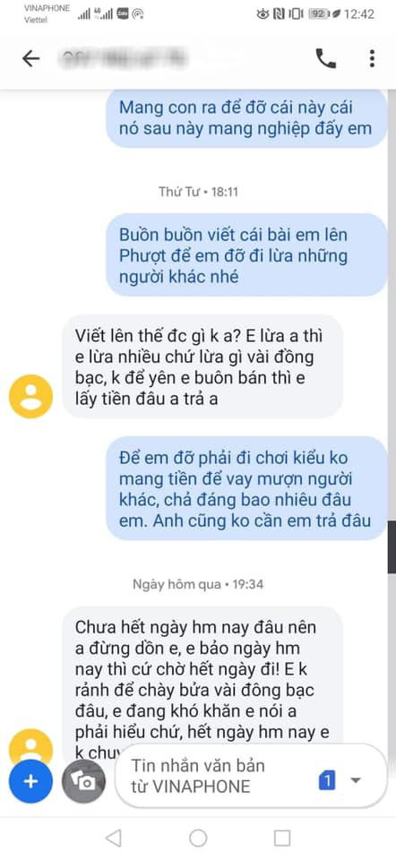 ''Ôi đúng cái giọng điệu lươn khươn mình ghét, chuẩn kiểu đặc trưng của mấy đứa trốn nợ, muốn bùng đây mà. Không có thì bảo không có xin khất, đây cứ để người ta hỏi rồi mới trình bày lý do, lại còn bảo chặn facebook để yên ổn lo tiền trả nữa chứ. Hài quá!'', bạn M.P bày tỏ.