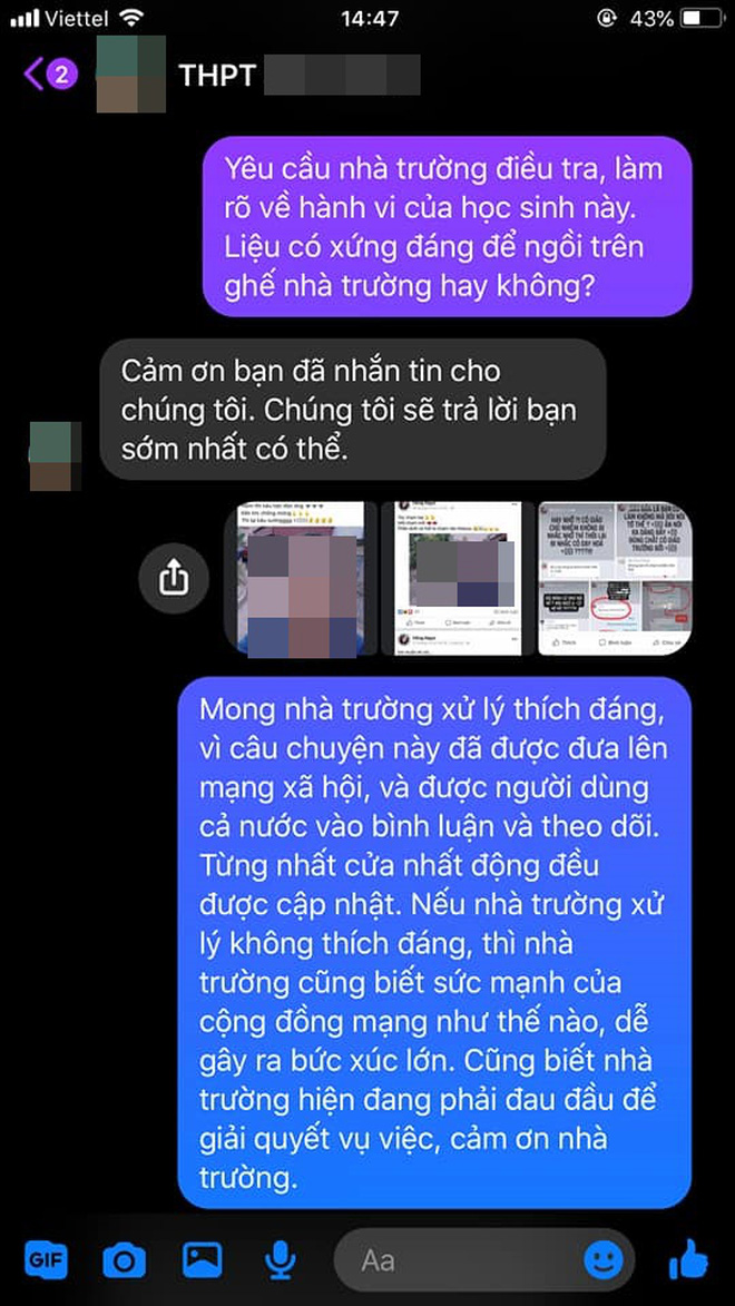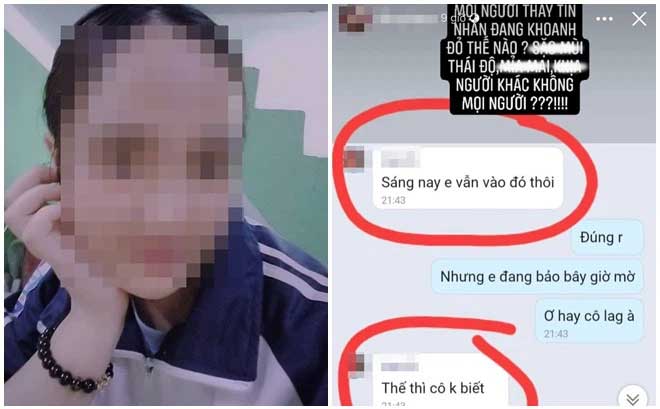 Học sinh này có điểm môn hoá kém. Tuy nhiên, không hiểu vì lý do gì mà khi nói chuyện với cô giáo bộ môn cùng các bạn xong, nữ sinh bỗng chụp tất cả lại rồi đăng lên mạng xã hội. Thậm chí khi trả lời tin nhắn của cô giáo, học sinh này đã dùng những từ ngữ vô lễ, không phù hợp.