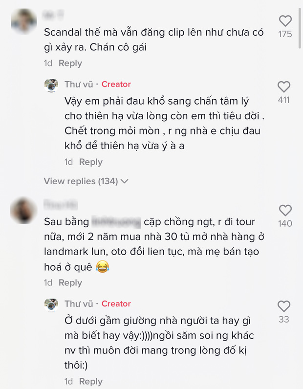Hay như khi một netizen khác kể lại một vụ scandal tương tự, Thư Vũ cũng thẳng thắn nhận xét: "Ở dưới gầm giường nhà người ta hay gì mà biết hay vậy? Ngồi săm soi người khác như vậy thì muôn đời mang trong lòng đố kị thôi".