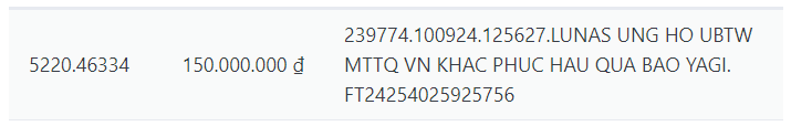 Không dừng lại ở đó, Huyền Baby còn ủng hộ với nhóm LUNAS (gồm Trang Pháp, Diệp Lâm Anh, Huyền Baby, Khổng Tú Quỳnh và Ninh Dương Lan Ngọc). Theo đó nhóm đã gửi đến bà con vùng lũ 150 triệu đồng đến MTTQ vào chiều 10/9 và kết quả “check VAR” cũng hoàn toàn trùng khớp.