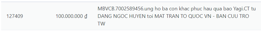 Theo đó Huyền Baby từng công khai ảnh màn hình ủng hộ vào số tài khoản Vietcombank của Mặt trận Tổ quốc Việt Nam là 100 triệu đồng. Giao dịch được thực hiện vào 12h37 ngày 11/9 với nội dung: “Ủng hộ bà con khắc phục hậu quả bão Yagi”, không để lộ thêm tên hay nickname của Huyền Baby.