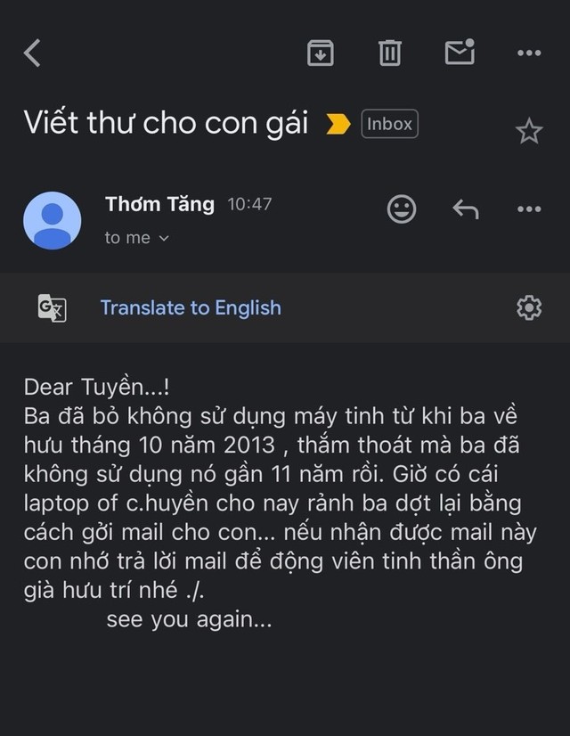 Tuyền Tăng tự hào: “Những tin nhắn trao đổi Zalo với gia đình, ba luôn tranh thủ vận dụng vốn tiếng Anh được học nhiều năm trước trong lớp học ngoại ngữ dành cho cán bộ hưu trí. Dù không hoàn hảo, nhưng ba không sợ sai và rất siêng năng luyện tập. Ba mình cũng không nhờ sự hỗ trợ nào của 2 con, tự mày mò, tải Google Translate, học cách giao tiếp với khách thuê nhà người nước ngoài.