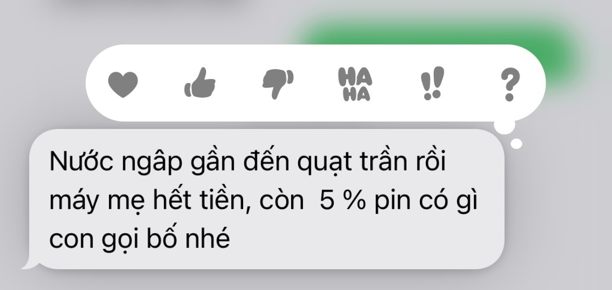 4h sáng, Thu Hà không thể nào diễn tả hết nỗi buồn và sự bất lực khi nhận được dòng tin nhắn của mẹ: "Nước ngập đến gần quạt trần rồi, máy mẹ hết tiền, còn 5% thôi. Có gì con gọi cho bố nhé".