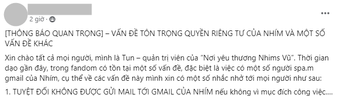 Theo đó, hiện có rất nhiều fan spam gmail của Long Vũ để nhờ duyệt bài, duyệt vào nhóm. Được biết đây là gmail được Vũ công khai ở phần thông tin Facebook với mục đích công việc. Nhưng fan tràn vào spam khiến các email công việc bị trôi xuống, trực tiếp ảnh hưởng trực tiếp đến Vũ và ekip. Vì vậy quản trị viên nhóm fan đề nghị “bất kỳ ai đã, đang và sẽ có ý định này ngừng lại ngay lập tức”.