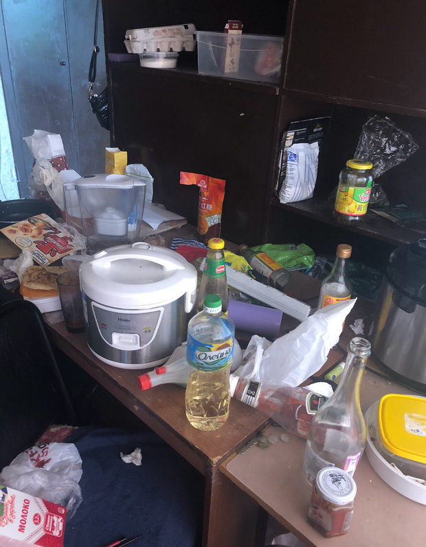 Dễ dàng nhận thấy, trong căn phòng, vỏ chai lọ, túi nilon, quần áo, thậm chí là đồ ăn vương vãi khắp nơi. Từ khu vực ngủ đến kệ bếp đều ngổn ngang rác, đồ đạc để lung tung, không được sắp xếp ngăn nắp. Ngay cả sàn nhà cũng đầy vết bẩn như cả mấy tháng không được quét dọn.