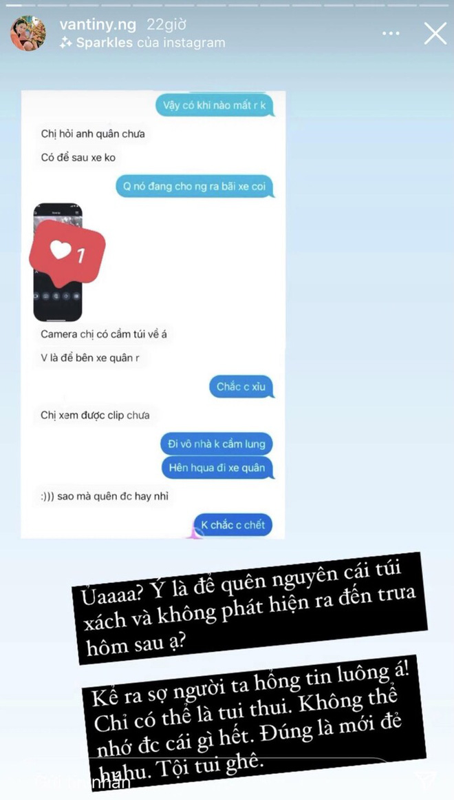 Không biết con dâu trùm điện tử dùng túi hiệu làm gì, chỉ biết có lần cô nàng quên mất túi ở quán ăn. Chắc do có quá nhiều túi rồi, Vân Tiny quên luôn sự tồn tại của chiếc túi mình đánh rơi, tới tận 2 ngày sau mới nhớ ra để tìm lại.