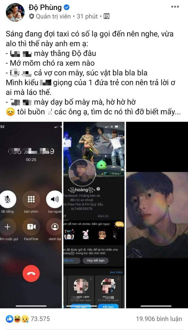 Không chỉ đăng tải hình ảnh cuộc gọi, Độ Mixi còn đăng đầy đủ hình ảnh, tên Facebook của thanh niên "trẻ trâu" kia. Tuy nhiên, sau đó Độ Mixi cũng gỡ bài đăng và đăng lời giải thích trong buổi livestream ngày 31/8: