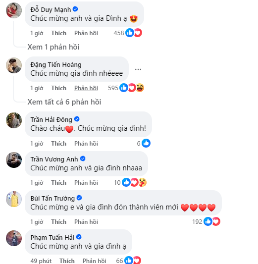Phía dưới hình ảnh này, không chỉ cư dân mạng mà rất nhiều người nổi tiếng trên MXH đã để lại bình luận chúc mừng. Từ giới streamer như ViruSs, Cris Phan, Rambo, Bomman, Nhism, Mimosa,… đến những gương mặt quen thuộc ở nhiều lĩnh vực khác như cầu thủ Văn Toàn, cầu thủ Duy Mạnh, thủ môn Tấn Trường, ca - nhạc sĩ OnlyC, Vương Anh Ole... đều gửi lời chúc mừng đến gia đình.