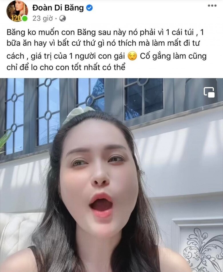 “Nhiều người nói không bắt con học thì sao nó nên người. Không phải các bạn ạ. Đâu có quy chuẩn chung nào của thế giới là các bạn phải học giỏi mới nên người, phải học giỏi mới giàu. Nhiều tỷ phú trên thế giới người ta không học hành đến nơi đến chốn nhưng vẫn có thể là tỷ phú, trở thành người có ích cho xã hội, làm việc to lớn dù bằng cấp không quá giỏi. Nên Băng không bắt con phải học giỏi” - Đoàn Di Băng tỏ rõ quan điểm.