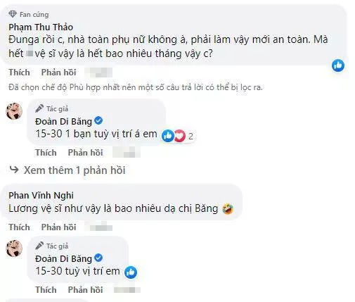 Về phía Đoàn Di Băng, trong một chia sẻ cô tiết lộ đội ngũ này rất chuyên nghiệp, làm việc xuyên ngày đêm bảo vệ chủ nhà. Để có được sự phục vụ tận tình ấy, cô cũng phải rút hầu bao mạnh tay để trả cho dịch vụ này nhưng chính chủ không tiết lộ cụ thể là bao nhiêu.