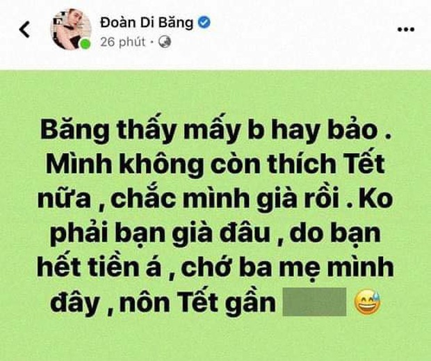 "Băng thấy mấy bạn hay bảo: 'Mình không còn thích Tết nữa, chắc mình già rồi'. Không phải bạn già đâu, do bạn hết tiền á. Chớ ba mẹ mình đây ,nôn Tết gần **** " là nội dung dòng trạng thái.