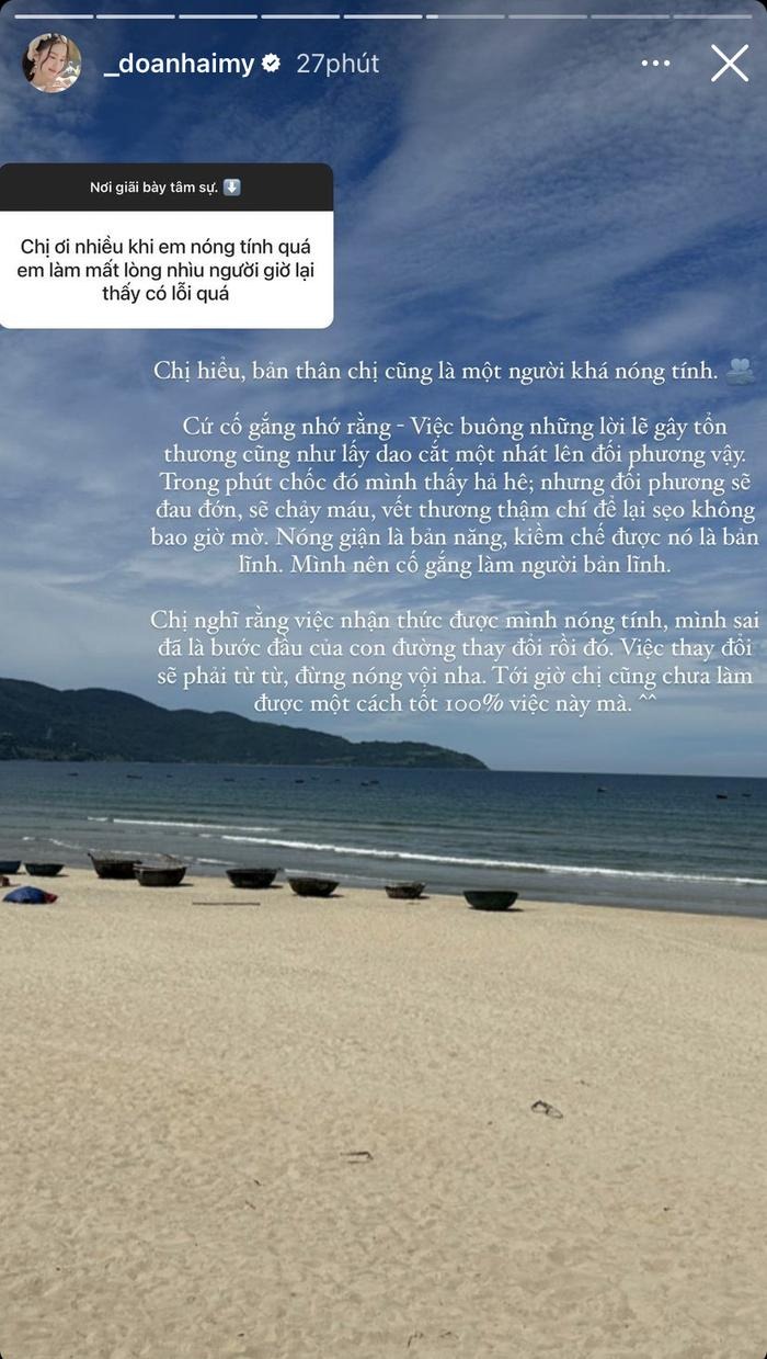 Khi trả lời fan, Doãn Hải My thẳng thắn thừa nhận bản thân là người khá nóng tính: "Cứ cố gắng nhớ rằng - Việc buông những lời lẽ gây tổn thương cũng như lấy dao cắt một nhát lên đối phương vậy. Trong phút chốc đó mình thấy hả hê; nhưng đối phương sẽ đau đớn, sẽ chảy máu, vết thương thậm chí để lại sẹo không bao giờ mờ. Nóng giận là bản năng, kiềm chế được nó là bản lĩnh. Mình nên cố gắng làm người bản lĩnh. Chị nghĩ rằng việc nhận thức được mình nóng tính, mình sai đã là bước đầu của con đường thay đổi rồi đó. Việc thay đổi sẽ phải từ từ, đừng nóng vội nha. Tới giờ chị cũng chưa làm được một cách tốt 100% việc này mà".