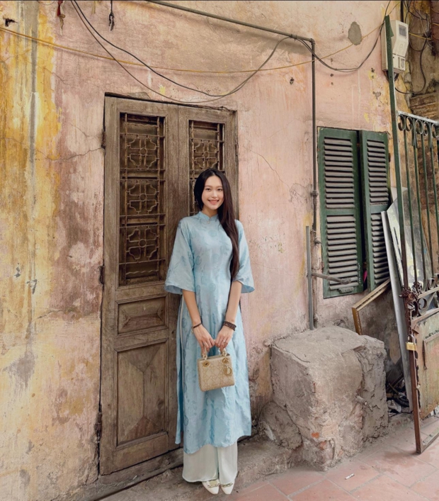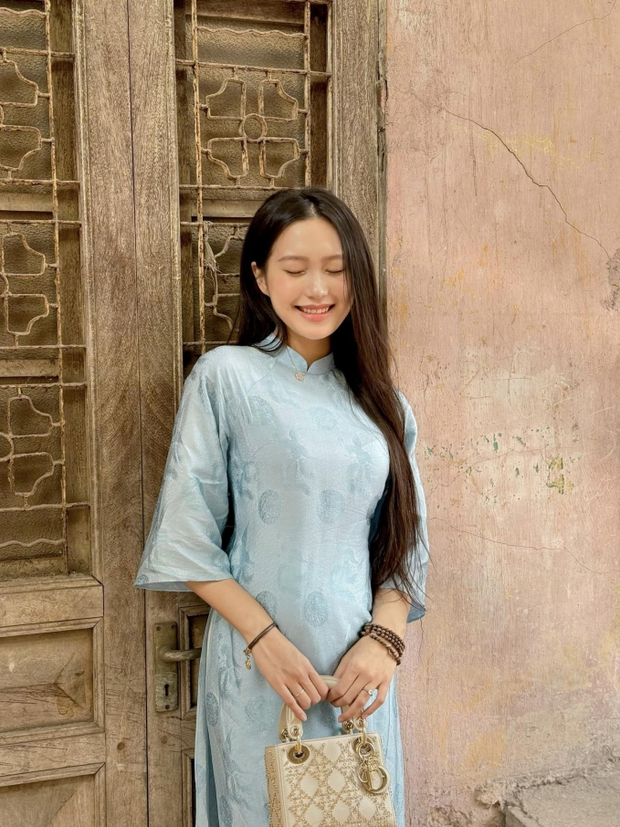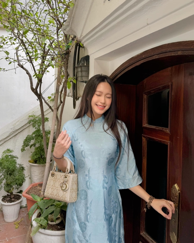 Trên trang cá nhân nàng WAG của Văn Hậu khoe trọn bộ ảnh mặc áo dài. Người đẹp sinh năm 2001 chọn áo tông màu xanh và chụp ngay tại không gian gần nhà bố mẹ đẻ.