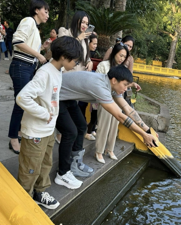 Một khoảnh khắc khác được hội fan của Đoàn Văn Hậu và Doãn Hải My chụp được khi Văn Hậu đang cho cá ăn. Mẹ vợ trẻ trung của chàng cầu thủ sinh năm 1999 cũng chăm chú nhìn con rể. Trong khi đó nàng WAG sinh năm 2001 nhanh chóng lấy điện thoại ra để ghi lại hình ảnh của chồng.