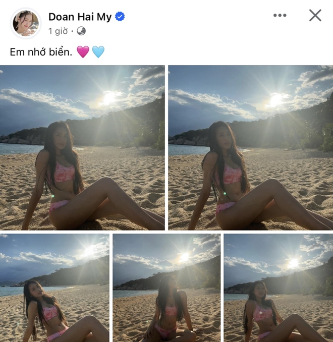 Nàng WAG Doãn Hải My vừa khoe trọn bộ ảnh diện bikini thả dáng trên bãi biển kèm trạng thái "em nhớ biển". Sở dĩ Doãn Hải My đang mang bầu con của Đoàn Văn Hậu nên cô nàng không được đi chơi nên nhớ lại khoảng thời gian "tự do bay nhảy".