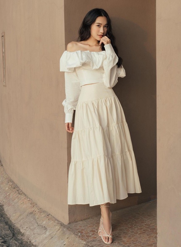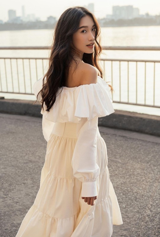 Trong đó, Doãn Hải My lựa chọn trang phục thanh lịch, dịu dàng như vô cùng quý phái, tinh tế. Tông màu nhẹ của bộ váy cũng hòa hợp với concept mùa thu mà cô nàng lựa chọn. Người đẹp top 10 Hoa hậu Việt Nam 2020 cho biết, cô thích mặc các thiết kế đơn sắc, kiểu dáng nhẹ nhàng, thanh lịch phù hợp hình thể, tính cách bản thân.