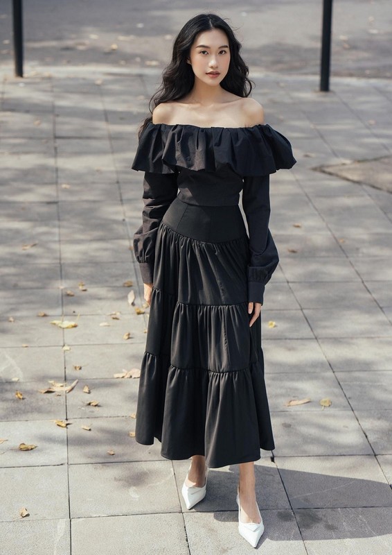 Ở một bộ trang phục khác, tông màu đen giúp tôn lên làn da trắng và vóc dáng thon gọn của Hải My. Ngoài hai bộ váy có phần theo hơi hướng sang trọng, Hải My cũng có những bộ trang phục khác trẻ trung hơn, gọn gàng hơn để cô nàng thuận tiện dạo phố.