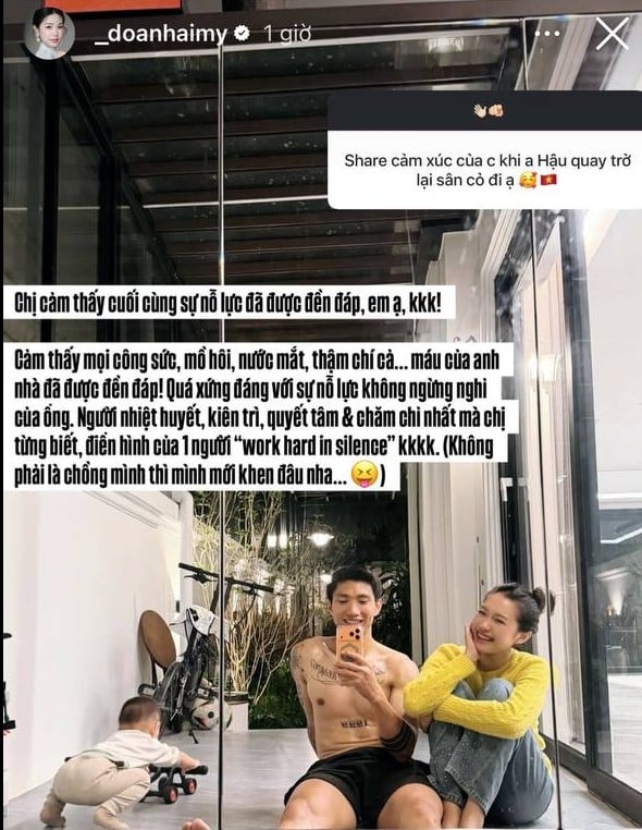 Đi kèm với những dòng chia sẻ đầy tự hào là bức ảnh đời thường ấm áp, ghi lại khoảnh khắc bình yên của gia đình. Trong ảnh, Văn Hậu khoe hình thể săn chắc bên cạnh một Doãn Hải My rạng rỡ và cậu con trai nhỏ đang vui đùa. Hình ảnh giản dị này như một minh chứng cho sự hạnh phúc và ổn định của gia đình sau những ngày tháng giông bão, khi cả hai phải cùng nhau đối mặt với áp lực và những nỗi lo về sự nghiệp sau chấn thương.