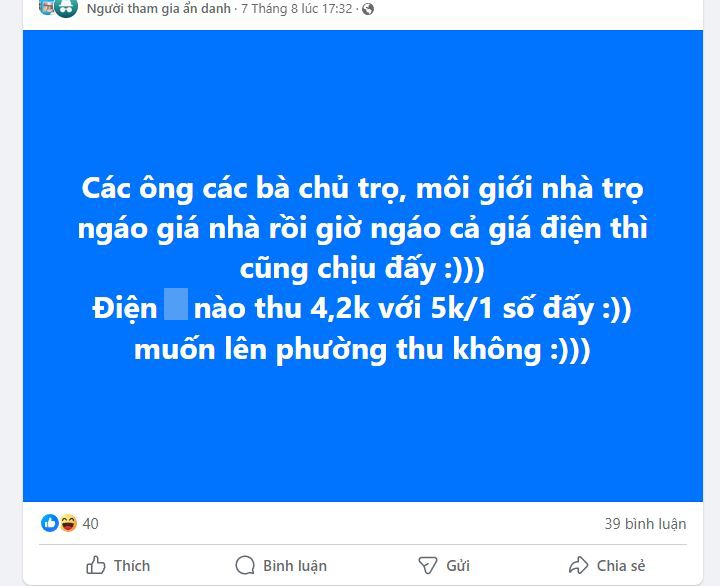 Bạn Hồng Anh (Thái Bình) chia sẻ: "Mình là sinh viên năm 3, mình và bạn vừa phải chuyển trọ vì chủ trọ đòi tăng thêm 100 nghìn tiền điện chung/người (bao gồm điện hành lang và điện ở dưới tầng 1 chỗ để xe). Khi mình thắc mắc tại sao lại đắt như thế thì chúng mình bị chủ trọ đuổi thẳng thừng".