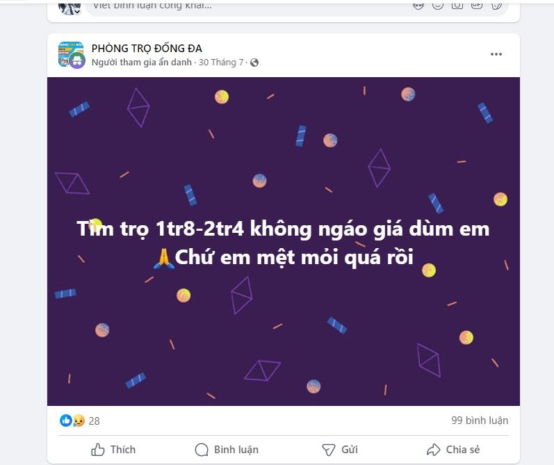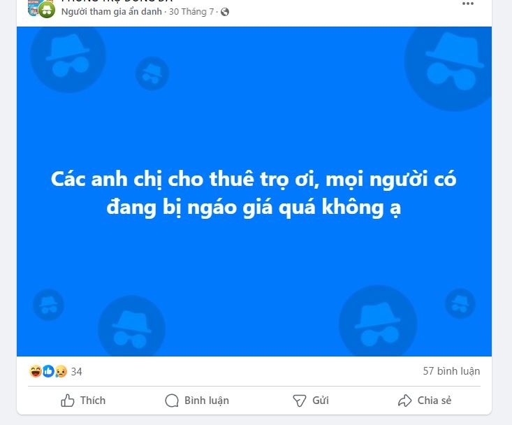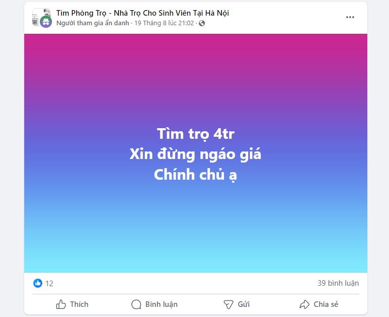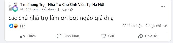"Phòng trọ Hà Nội ngáo giá", hay "chủ trọ ơi xin đừng ngáo giá",... hiện đang là những cụm từ hot nhất trên mạng xã hội lúc này. Dạo một vòng các nhóm cho thuê phòng trọ ở Hà Nội có thể thấy không ít bài đăng của các tân sinh viên và cả sinh viên năm 2, 3, 4 thể hiện sự bức xúc với giá phòng trọ cao một cách quá đáng. Một số phòng trọ trông vô cùng xập xệ, thậm chí tận dụng lại từ phòng bếp cũ của gia đình, hành lang,... cũng hét giá 2-3 triệu/phòng.