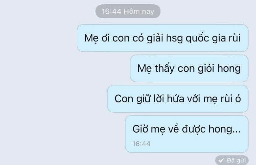 Chủ nhân đoạn tin nhắn sau đó chia sẻ thêm, rằng khi biết mình đạt giải, em đã mừng đến mức hét lên và theo phản xạ gọi “mẹ ơi”. Rồi ngay khoảnh khắc ấy, niềm vui khựng lại, nước mắt trào ra. Lời hứa năm nào với mẹ đã thực hiện được, chỉ tiếc rằng người để nghe tin vui ấy không còn ở đây.