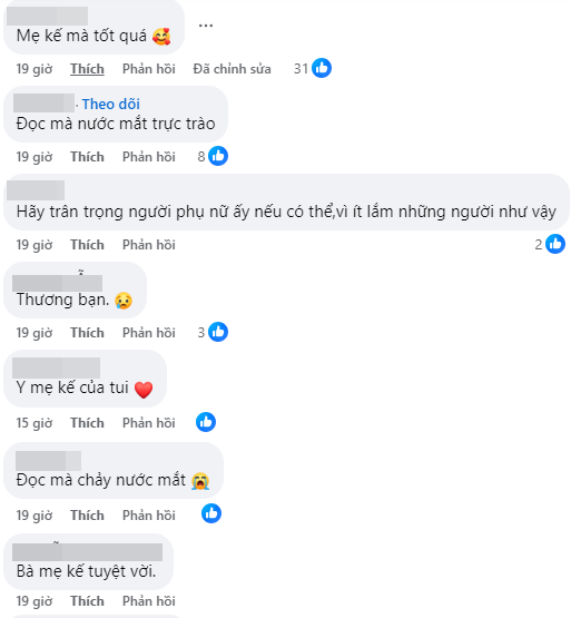 Dưới phần bình luận, nhiều người cảm thấy thật ngưỡng mộ mối quan hệ của họ, một điều mà không phải gia đình nào cũng làm được. Có lẽ người mẹ này cũng đã rất yêu thương và đối xử tốt với các con nên mới nhận lại được tình cảm như thế. Cô con gái cũng nhận ra ba mình là một người có nhiều khuyết điểm vì thế cũng chỉ mong những người đến sau được hạnh phúc, dù đó không phải là mẹ của mình.