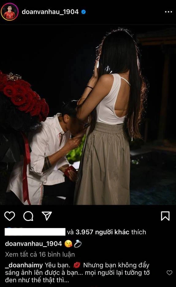 Khoảnh khắc của Văn Hậu khiến hội "anh em đã có vợ" đồng cảm sâu sắc và dự đoán Văn Hậu sẽ sớm gia nhập "hội sợ vợ". Trước đó, khi đăng ảnh cầu hôn Hải My lên Instagram, anh chàng đã bị vợ chưa cưới vào "mắng yêu" khiến ai cũng bật cười.