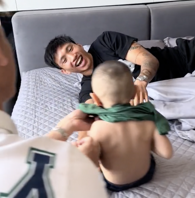 Mới đây, nàng WAG Hiếu Phạm - bà xã hậu vệ Hồ Tấn Tài đã chia sẻ khoảnh khắc vui nhộn khi cặp đôi Đoàn Văn Hậu - Doãn Hải My ghé thăm gia đình cô. Văn Hậu nằm kềnh trên chiếc giường rộng, vui đùa cùng bé Tiger - con trai đầu lòng của Hồ Tấn Tài và Hiếu Phạm. Bên cạnh anh là bạn gái Doãn Hải My.