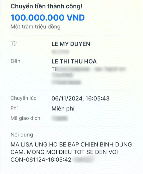 Trước đó, đầu tháng 11/2024 - thời điểm Phạm Thoại kêu gọi cộng đồng ủng hộ giúp đỡ mẹ con bé Bắp, “sếp em” Mailisa cũng thông báo đã chuyển 100 triệu đồng vào số tài khoản của mẹ Bắp. Nữ doanh nhân cho biết thời gian vừa qua bận nhiều công việc nên không biết đến trường hợp của bé Bắp nhưng khi livestream cô được cư dân mạng tag nhờ giúp đỡ bé rất nhiều. Sau khi tìm hiểu, Mailisa biết được câu chuyện của bé Bắp, cô liền góp một phần cùng với mọi người gửi đến 2 mẹ con.