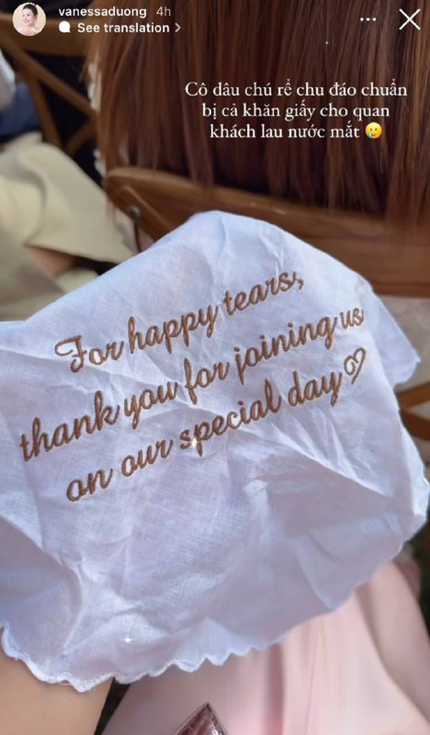 Không chỉ tặng mẹ chiếc tay độc lạ, vợ chồng tiểu thư Hà Thành còn chu đáo chuẩn bị cho cả dàn khách mời với lời nhắn nhủ: "Dành cho những giọt nước mắt hạnh phúc. Cảm ơn vì đã đến tham dự cùng chúng tớ trong ngày trọng đại này!" (tạm dịch).