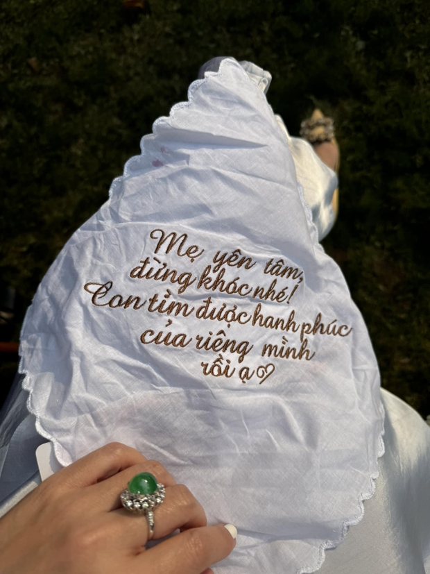 Cô nàng tặng mẹ 1 chiếc khăn tay thêu những dòng chữ an ủi: "Mẹ yêu tâm, đừng khóc nhé! Con tìm được hạnh phúc của riêng mình rồi ạ!". Cô Văn Thỳ Dương cũng đăng tải chiếc khăn tay trên MXH kèm theo dòng caption: "Khăn lau nước mắt".