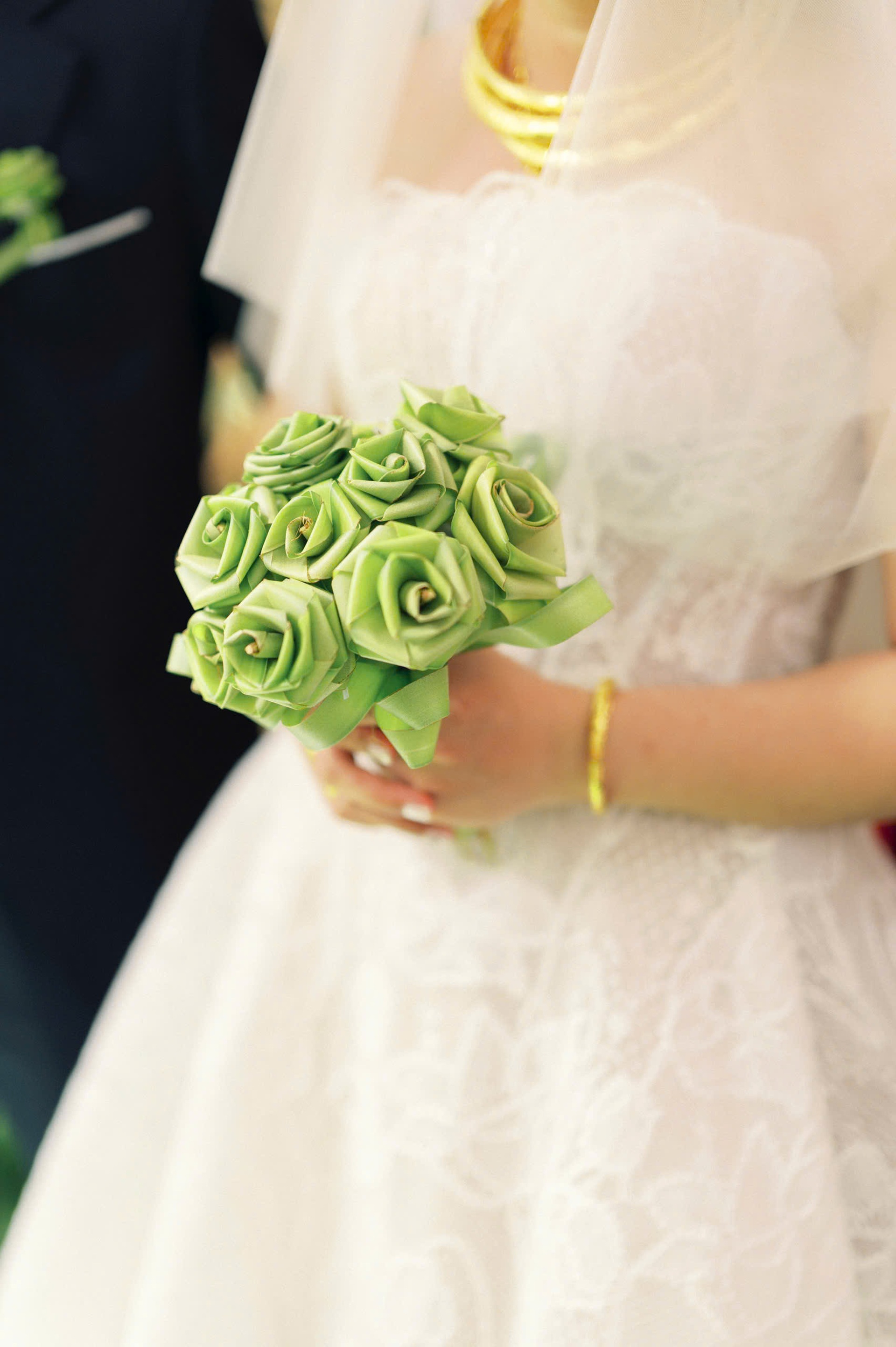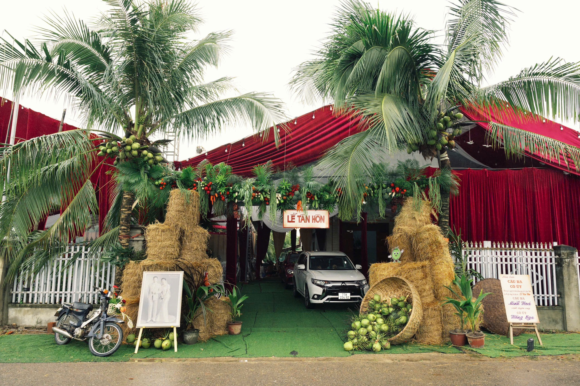 Không chỉ cổng đám cưới làm bằng thân, lá dừa, thậm chí, ngay cả hoa cưới của cô dâu cũng tận dụng từ chính những cây đu đủ sau nhà hoặc tết từ lá dừa. Ngoài ra, ngày vui của anh chị cũng liên tục có sự xuất hiện của cây dừa trong nhiều nghi thức đặc biệt như cùng nhau trồng cây dừa, chặt trái dừa.