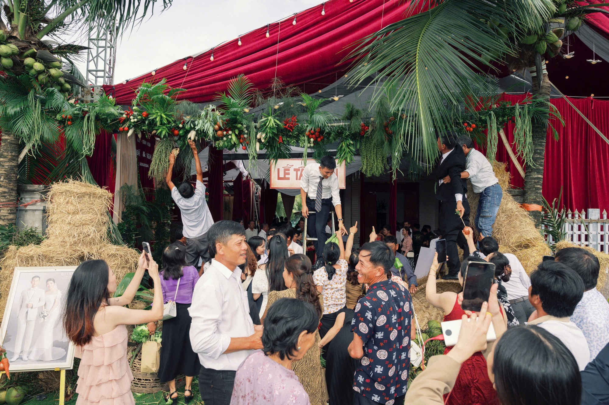 Sau đám cưới, cặp đôi cũng vô cùng nhiệt tình hái tất cả những loại rau củ được trang trí xuống tặng khách. Ai cũng vui mừng nhận lấy những món quà này, dù không mang giá trị lớn về vật chất nhưng lại vô tình tạo ra sự gắn kết, gần gũi giữa mọi người trong ngày đặc biệt.