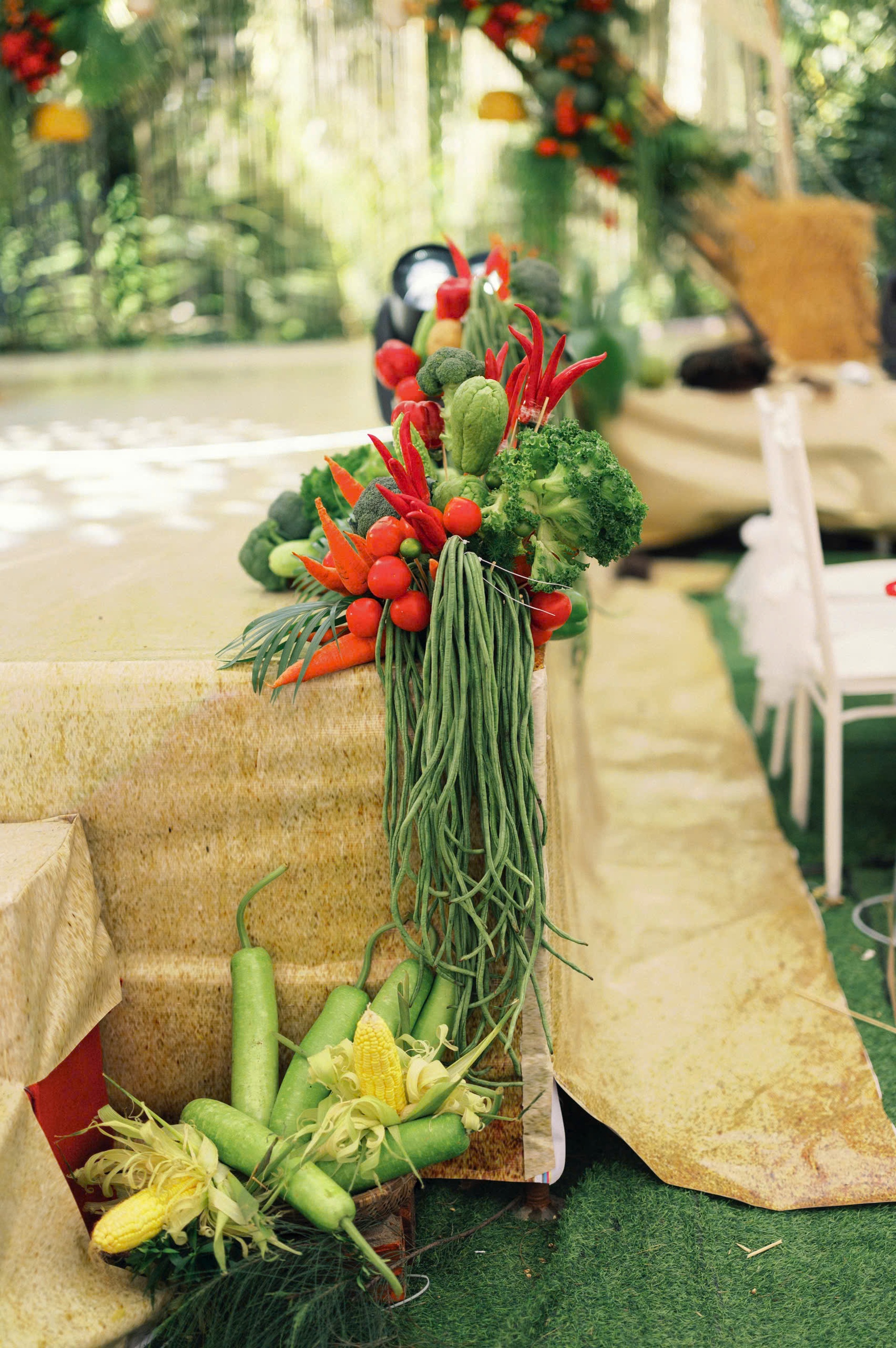 Trong những bức ảnh, đoạn video được chia sẻ, có thể thấy, tất cả những đồ trang trí trong đám cưới đều làm bằng các loại trái cây, rau củ dân dã có thể sử dụng. Từ cổng cưới cho đến trang trí dọc lễ đường, khán đài… đều được làm từ những trái ớt chuông, củ cà rốt, bông súp lơ, khổ qua, dưa chuột, đỗ đũa… Những loại rau củ tưởng chừng quen thuộc và bình dị nhưng khi nó ở “một vị trí khác” dưới bàn tay khéo léo cùng sự phối hợp đầy hài hoà đã mang vẻ đẹp đặc biệt, khiến đám cưới của cô dâu Hồng Nga và chú rể Minh Hoá nổi bật hơn bao giờ hết.
