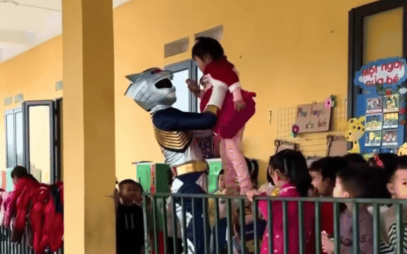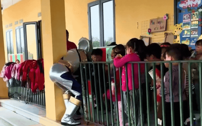 Và quả thật cách này hiệu nghiệm, tất cả lũ trẻ khi nhìn thấy ông bố này tự nhiên ùa ra, nhao nhao thi nhau xin được sờ, chạm vào, thậm chí là xin được bế một cái. Cảnh tượng hỗn loạn đến nỗi các cô giáo cũng phải phì cười.