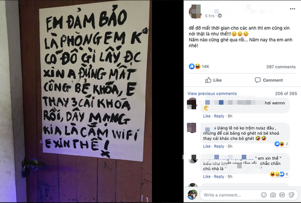 "Em đảm bảo phòng em không có đồ gì lấy được. Anh đừng mất công phá khoá, em thay 3 cái khóa rồi. Dây mạng kia là cắm wifi. Em xin thề!", nội dung được viết bằng mực đen nổi bật trên tờ giấy khiến nhiều người bật cười.