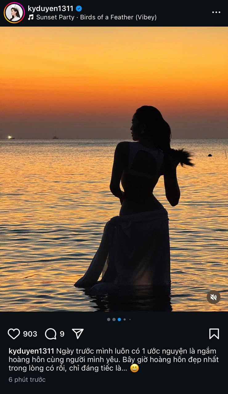 Giữa lúc chuyện tình cảm được quan tâm, nàng hậu sinh năm 1996 lại có động thái lạ trên mạng xã hội. Theo đó, Hoa hậu Kỳ Duyên đăng bức ảnh ngắm hoàng hôn đính kèm dòng chú thích: "Ngày trước mình luôn có 1 ước nguyện là ngắm hoàng hôn cùng người mình yêu. Bây giờ hoàng hôn đẹp nhất trong lòng có rồi, chỉ tiếc là...".
