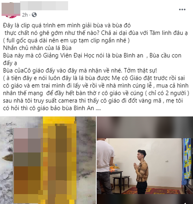 Trong bài đăng của người tự nhận là chị gái Trọng Hưng cũng nêu rõ: "Bùa này mà cô Giảng Viên Đại Học nói là bùa bình an, bùa cầu con đấy ạ. Bùa của Cô giáo đấy, vào đây mà nhận về nhé...".