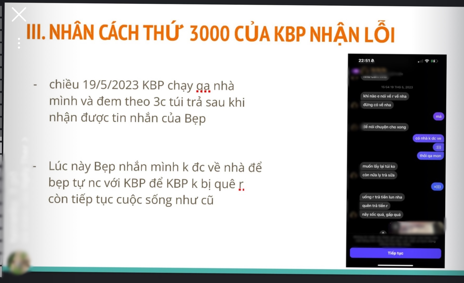 Câu chuyện vẫn chưa dừng lại ở đó, vì theo lời của L. sau khi nhận đủ 3 chiếc túi hiệu đã mất, cô phát hiện đôi giày của mình cũng “không cánh mà bay”. Tuy nhiên, K.B nói rằng đây là đôi giày cô mua lại trước đó, vì không muốn làm to chuyện này, để cô em gái B. - người chơi thân với K.B vui vẻ, nên L. giữa im lặng.