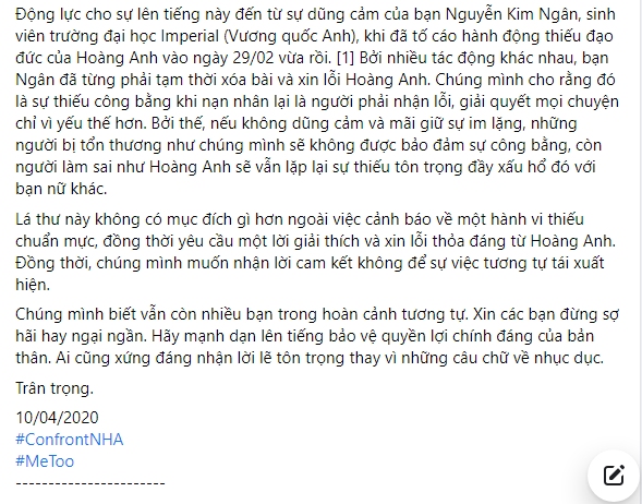 Mặc dù bài tố cáo đã được đăng từ năm 2020, nhưng ngay sau khi Ngô Hoàng Anh lọt vào danh sách, bài viết lại được chia sẻ rần rần. Anh bị nhiều người lên tiếng chỉ trích. Trước dư luận ồn ào, Ngô Hoàng Anh có động thái mới nhất là khóa trang cá nhân để tránh phiền toái.