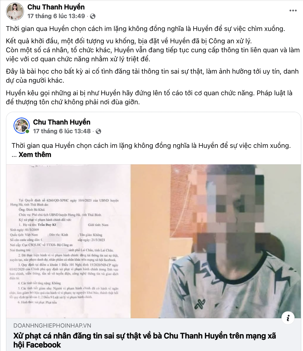 Hai ngày trước, bà xã Quang Hải cũng gây xôn xao khi đăng tải thông tin về việc một cá nhân bị xử phạt vì đăng tin sai sự thật về Chu Thanh Huyền trên mạng xã hội Facebook. Cô nàng chia sẻ: "Thời gian qua Huyền chọn cách im lặng không đồng nghĩa là Huyền để sự việc chìm xuồng. Kết quả khởi đầu, một đối tượng vu khống, bịa đặt về Huyền đã bị Công an xử lý. Còn một số cá nhân, tổ chức khác, Huyền vẫn đang tiếp tục cung cấp thông tin liên quan và làm việc với cơ quan chức năng nhằm xử lý triệt để.