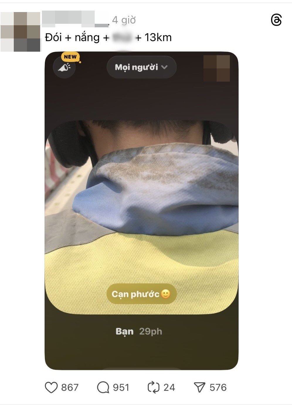 Câu chuyện bắt đầu khi một tài khoản trên Threads đăng tải bức ảnh chụp từ phía sau một tài xế xe ôm công nghệ, kèm dòng caption ngắn gọn: “Đói + nặng + th** + 13km”. Trước đó, bức ảnh này cũng từng xuất hiện trên Locket với dòng chữ “cạn phước”. Nội dung bài đăng khiến nhiều người hiểu rằng cô gái đang than phiền về mùi cơ thể của tài xế trong suốt quãng đường di chuyển.
