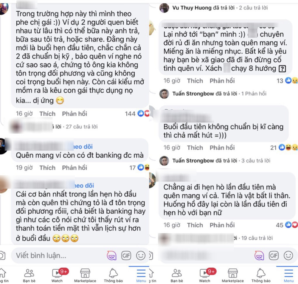 "Tóm lại là không phải chuyện đào mỏ hay không. Nhưng thật sự không mang ví thì chuyển khoản cũng được mà. Quan trọng là nam giới nên thể hiện sự ga lăng và lịch sự trong buổi đầu gặp gỡ. Còn các bạn nữ cũng nên xem xét lại mình, miệng lúc nào cũng nữ quyền, bình đẳng nhưng động đến chuyện là đổ hết cho đàn ông. Người có giá trị sẽ gặp được người hiểu giá trị của bản thân chứ kiêir siêng ăn nhác làm thì chỉ 1 - 2 lần là người ta biết thôi!"