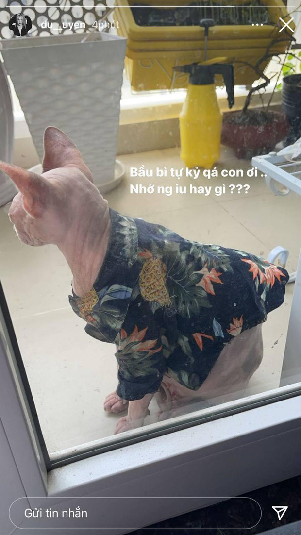 Dĩ nhiên, ngay sau dòng trạng thái khá "gắt" của nam ca sĩ, Du Uyên cũng có những động thái mới. Cụ thể, trưa ngày 28/04, cô nàng đăng ảnh chú mèo cưng cùng dòng trạng thái: "Bầu bì tự kỷ quá con ơi... Nhớ người yêu hay gì?". Dường như Du Uyên không mảy may quan tâm đến status của bồ cũ.