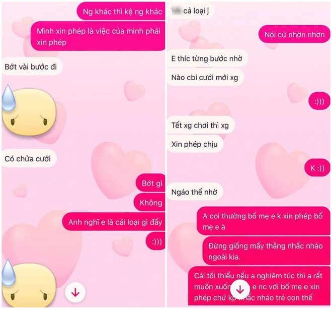 Chưa kể còn xem thường mình đến mức bảo khi nào chửa thì mới xuống xin phép "bắt trâu bắt nghé" cả thể luôn. Có mỗi cái việc xin phép thôi mà khiến mình ức chế thật sự. Không biết mình đề nghị thế là đúng hay cổ hủ. Giờ 2020 rồi thì yêu đương có cần đến nhà xin phép bố mẹ cho tìm hiểu nữa hay không?"
