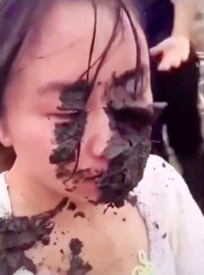 Tưởng cam chịu, ai ngờ đâu ở khúc sau video, chàng trai bỗng… úp nguyên tô mì đang ăn dở vào mặt cô gái. Chưa dừng lại ở đó, trước khi quay lưng bỏ đi anh còn không quên lấy đất bôi lên mặt bạn gái.