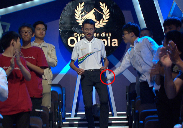 Cụ thể, đó là khi nam sinh Nông Quốc Huy (THPT Bắc Kạn) đang đi từ trong cánh gà ra chào khán giả, một cậu bạn cùng lớp đã vươn tay ra định vỗ người động viên. Ai dè lại đụng trúng... mông của Quốc Huy khiến anh chàng này giật mình phải quay lại xem đó là tay ai.