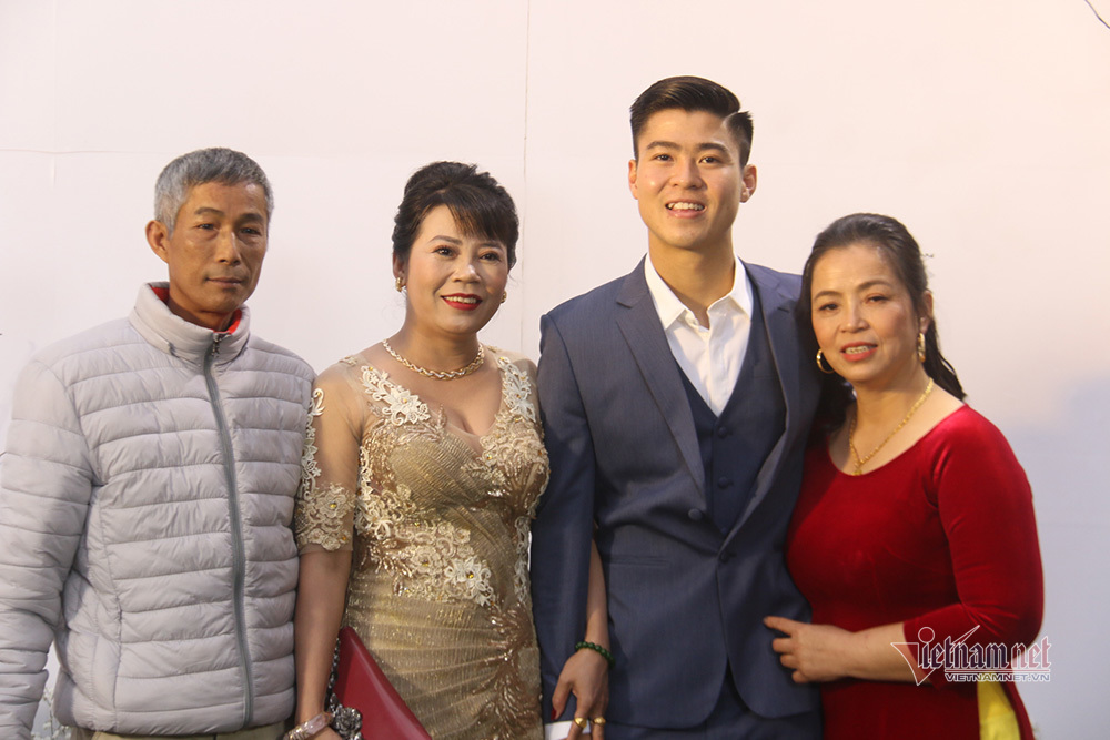 Cầu thủ Duy Mạnh trong bộ vest lịch lãm xuất hiện từ sớm cùng bố mẹ đón khách.